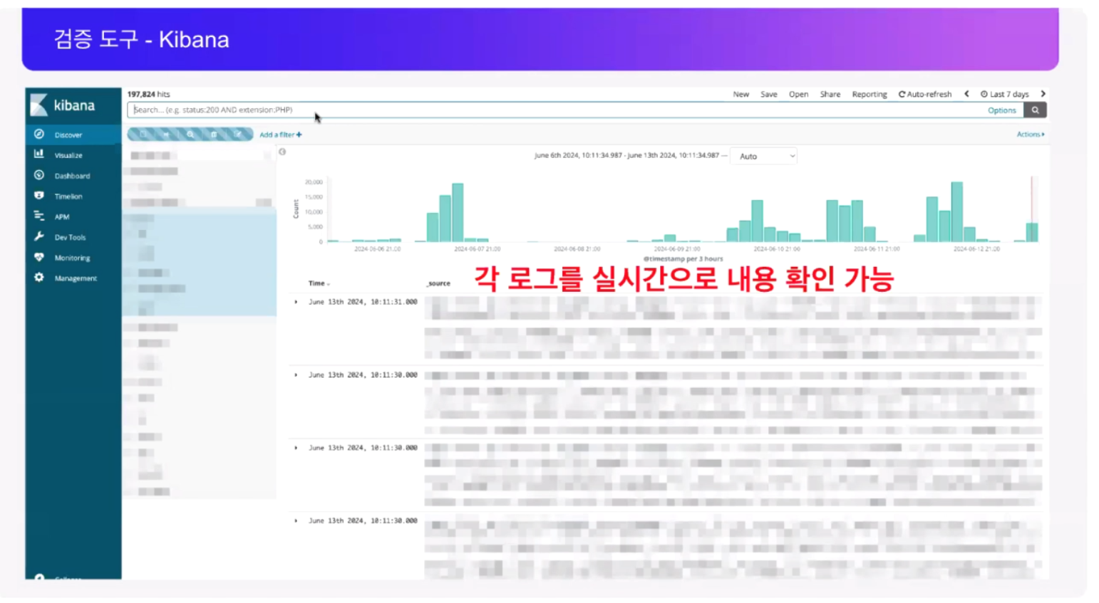 로그 검증 도구는 Kibana를 사용하며, Elastic search, Logstash와 같이 사용하여 ELK 시스템을 구축하고 있다고 합니다.