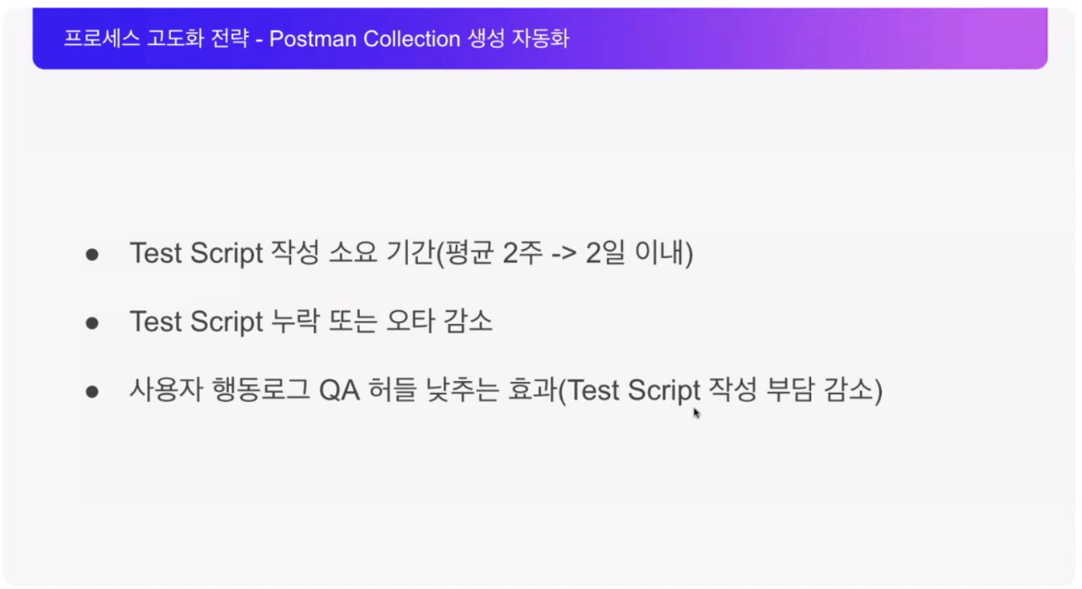 그래도 Postman 기능과 개발요청서를 잘 활용한다면 테스트 스크립트 생성을 자동화할 수 있기 때문에 공수 절감에 큰 영향을 준다고 합니다 😀