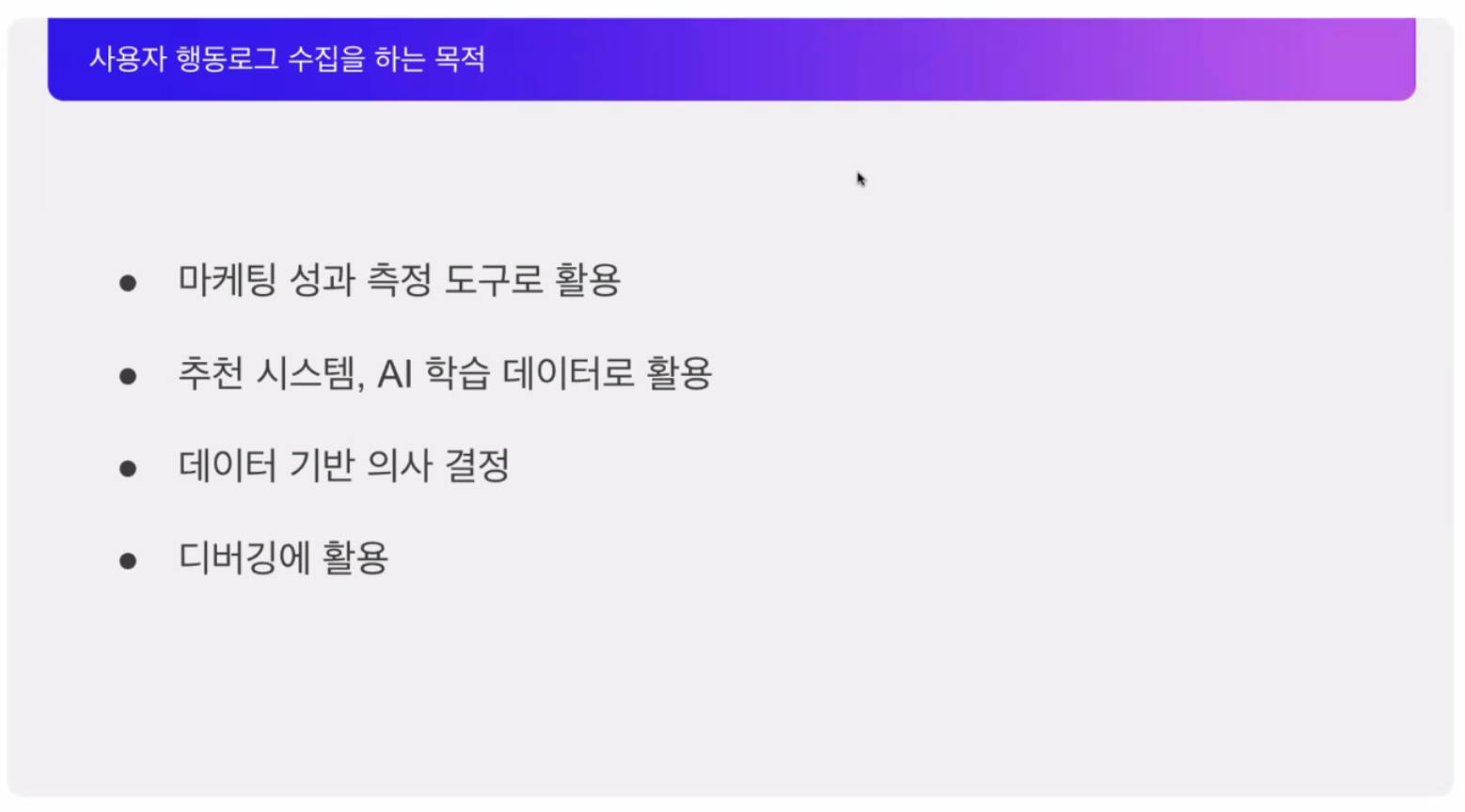 여기어때를 사용하는 사용자가 어떤 행동을 했는지 로그로 기록하는 것이 "사용자 행동로그"라고 말씀해 주셨습니다. 이렇게 쌓인 데이터를 분석하여 사용자가 어떤 행동을 하는지, 분석하여 어떤 상품을 추천해야 하는지 학습 데이터로 쓴다고 하네요.