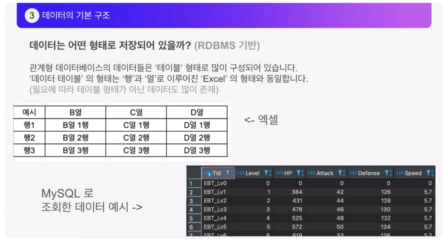 데이터의 기본 구조 형식을 보여주면서 관계형 데이터베이스 시스템(RDBMS)의 구조를 간략하게 알려주셨습니다. 게임 QA에서 사용하는 데이터 구조 설계에 대한 안내를 해주셨고, 직접 DB 연결고리를 보여주시면서 설명해주셨습니다.