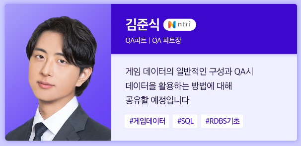 QA 컨퍼런스의 다섯 번째 발표는 김준식 님이 발표해 주셨습니다. 게임에서 사용하는 데이터의 의미, 데이터의 구성 방식과 QA 업무 중 데이터를 활용하여 게임 검증을 하는 방식에 대해 간략하게 소개해주셨습니다.