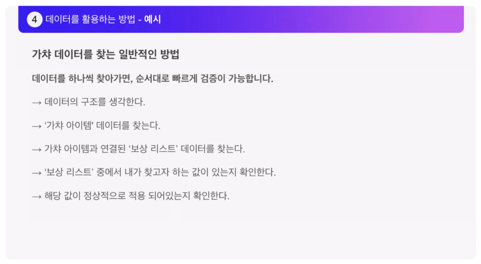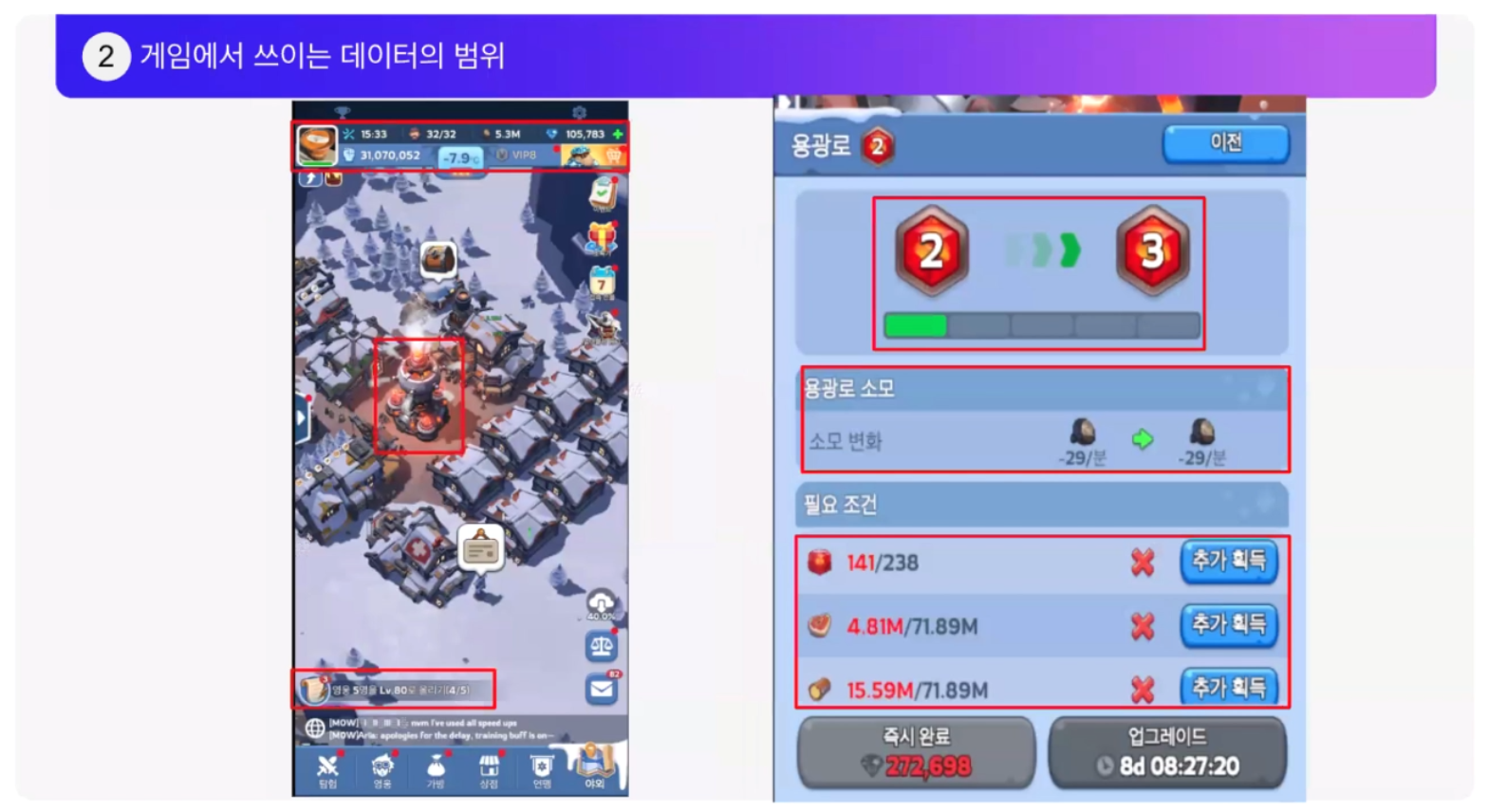게임에서의 데이터는 여러 종류가 있는데, 재화나 경험치, 레벨, 확률 등 다양한 곳에 데이터가 들어가 있다고 설명해 주셨습니다. 결국엔 게임은 데이터로 성장을하고 싸우고 발전하는 것이기에 게임에서 데이터가 모든 곳에서 영향을 가진다는 느낌으로 알려주셨습니다.