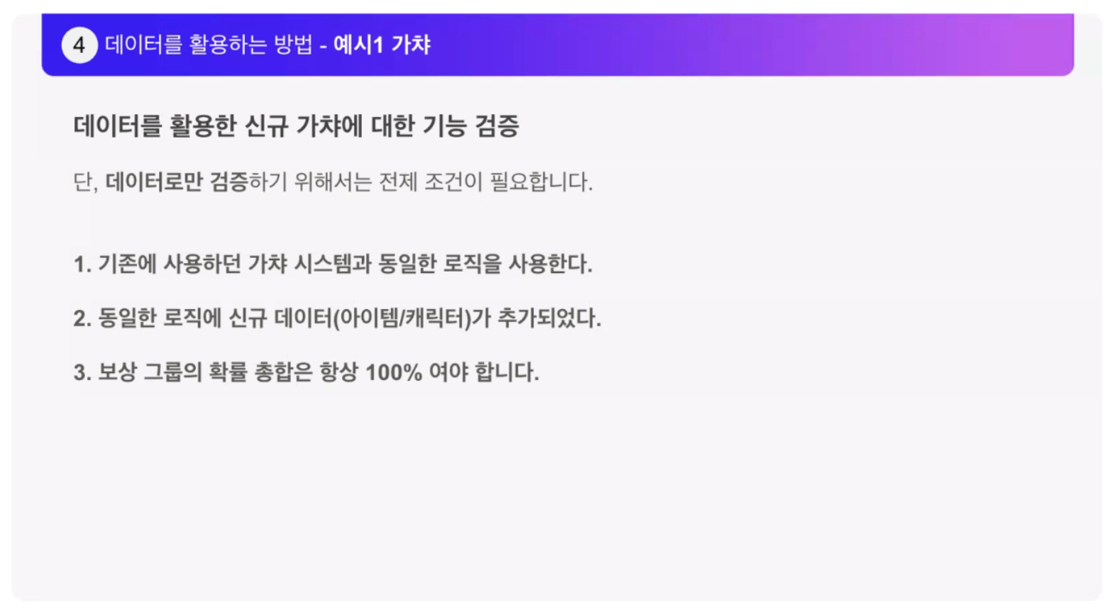 새로운 캐릭터나 아이템이 나오는 경우를 예로 들어 설명해 주셨습니다. 신규 데이터가 추가 시 현재 사용하는 가챠 시스템을 그대로 활용하여 동일한 로직에 새로운 아이템 데이터를 추가하고, 이전과 동일한 방식으로 가챠 시스템을 N번 수행해서 나온 결괏값을 확인한다고 하네요.