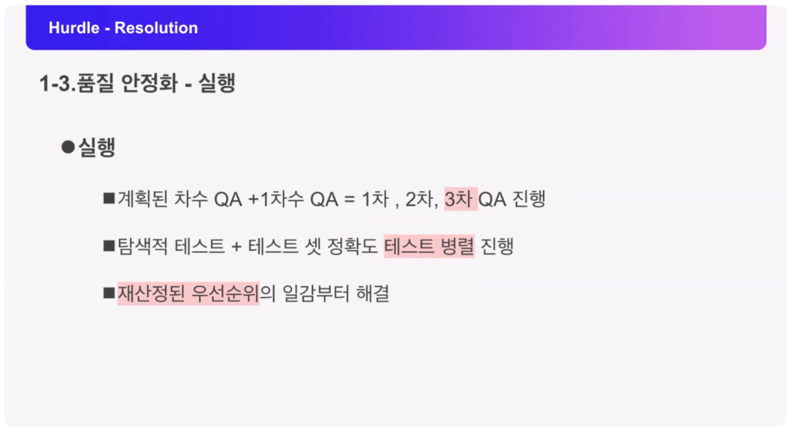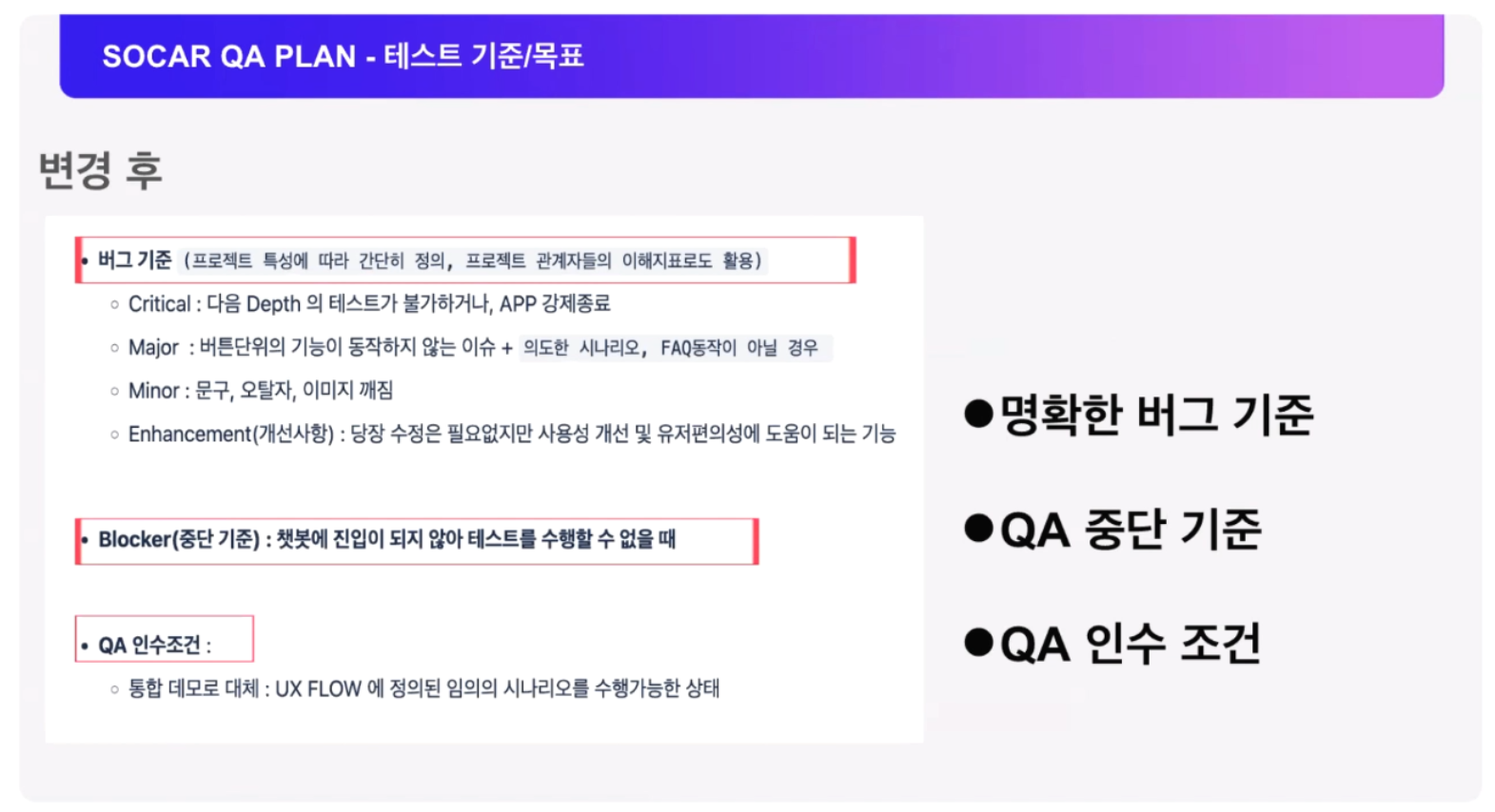 버그 측정 기준을 명확하게 제시하여 버그 발생 시 작성된 기준으로 이슈를 분류하여 관리하셨다고 하네요. 그리고 QA 작업을 수행할 수 없는 중단 조건과 인수 조건도 정의하여 QA 작업이 정상 진행 될 수 있을 때 테스트 버전을 전달받아 테스트를 수행한다고 하네요.