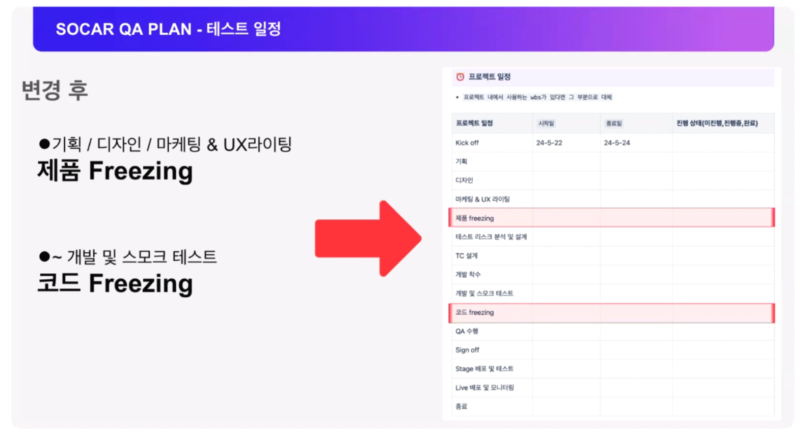 그리고 제품 프리징 기간을 두어 기획이나 디자인이 더 이상 바꾸지 않는다는 일정을 수립하였고, 코드 프리징 기간을 두어 개발 자체 테스트까지 진행된 버전을 개발해야 하는 기간을 설정했다고 하네요.