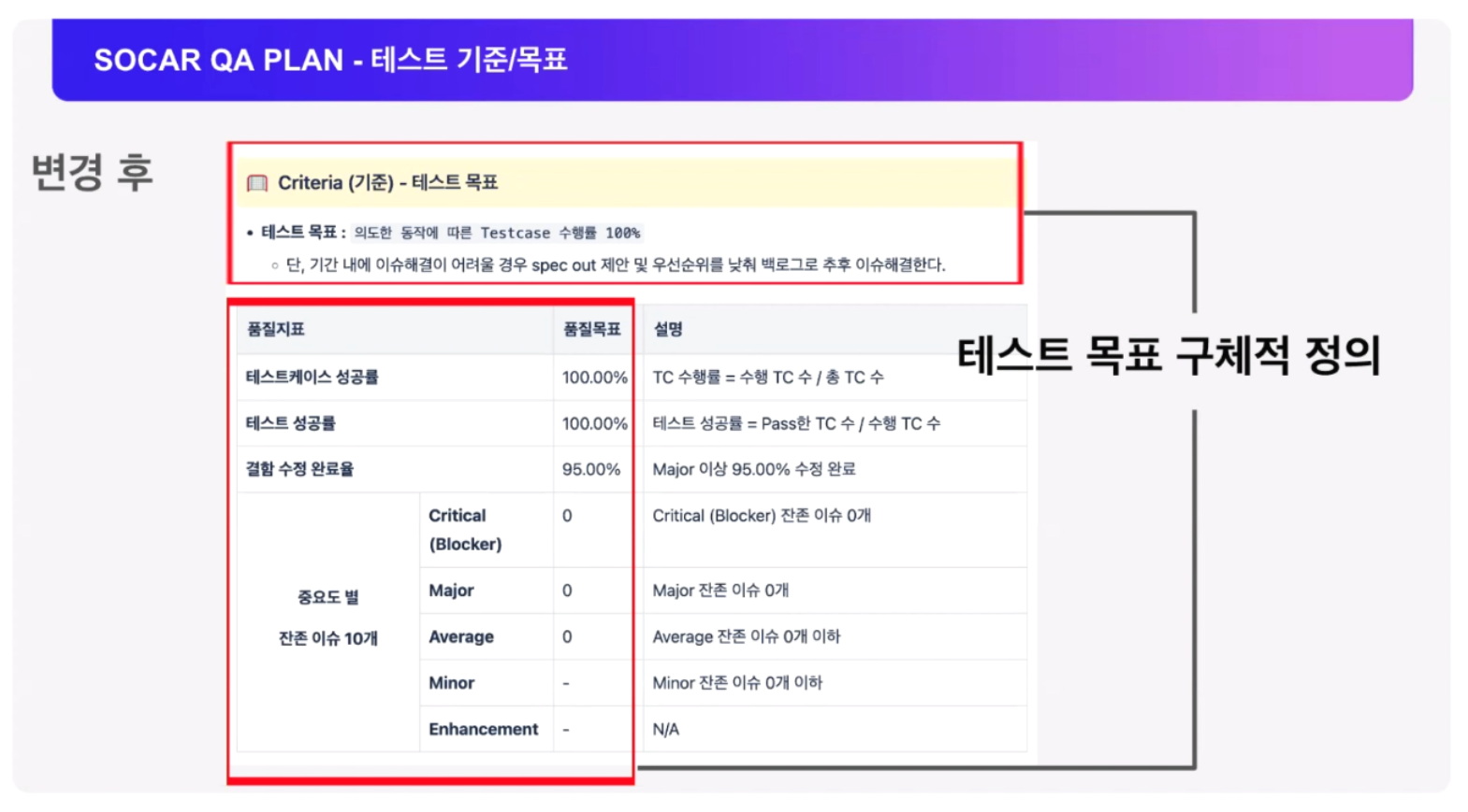 그로 인해 테스트 시작 전 테스트 목표를 명확하게 수립할 수 있었다고 합니다. 이슈의 중요도 설정의 의미를 명확하게 하고, 중요도 별 성공에 대한 기준과 테스트 케이스의 수행 및 성공률의 기준을 수립하여 테스트 수행 후 기준을 만족해야 성공이라는 판정을 했다고 하시네요.