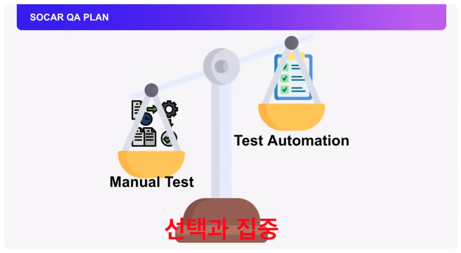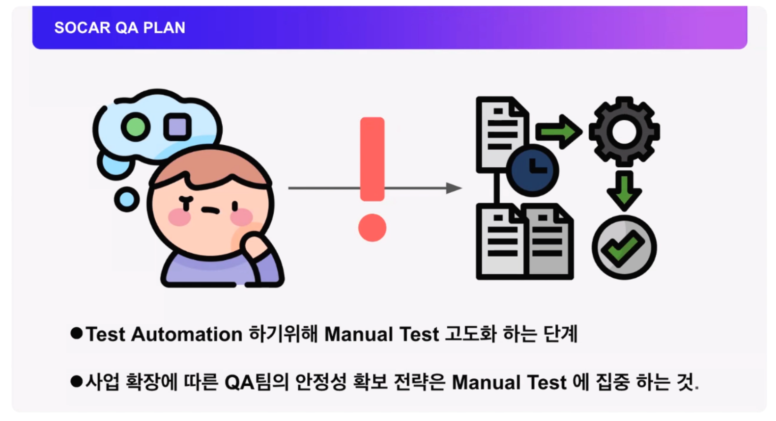 쏘카의 QA의 작업은 자동화 테스트보다 매뉴얼 테스트의 고도화를 우선으로 생각하여 작업을 진행했다고 하셨습니다. 매뉴얼 테스트에 대한 프로세스가 명확하지 않았기 때문에 자동화 테스트를 진행하여도 프로세스가 수립되지 않으면 타 팀과 의사 협의나 자동화 개발 순서도 꼬일 수 있기 때문에 매뉴얼 테스트의 프로세스를 수립과 고도화 작업을 우선으로 하게 되었다고 하셨습니다. 이렇게 명확한 프로세스가 구축된다면 자동화 테스트 프로세스도 자연스럽게 수립될 것이다라고 판단했다고 하시네요.