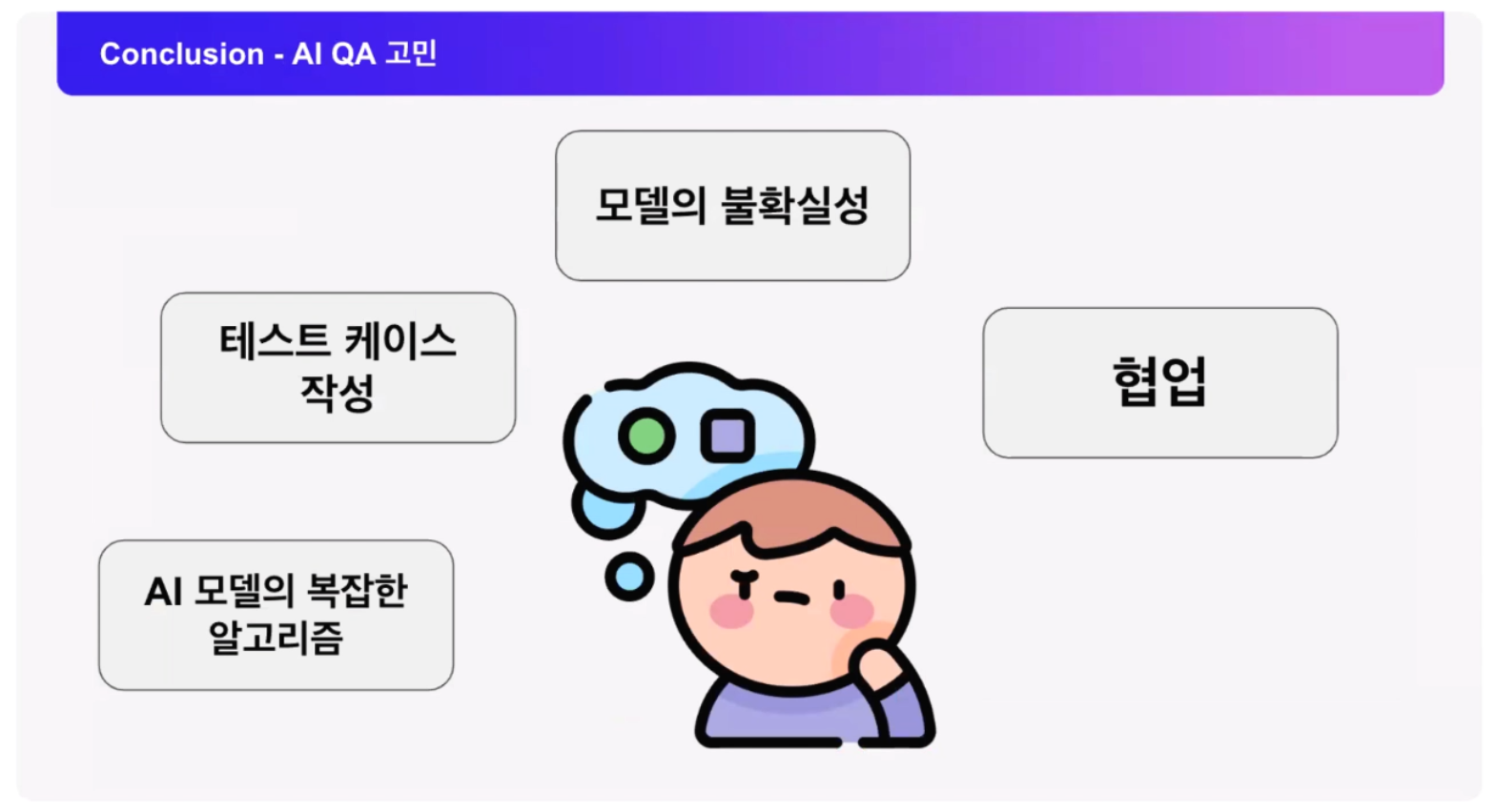 그리고 AI QA의 고민도 해결해야 하는 부분이라고 하셨는데, 해결한 방식은 프로세스를 명확하게 하고 체계적인 QA 계획으로 해결했다고 하셨습니다. 프로세스가 잡힌다면 각각의 팀의 역할이 명확하기 때문에 자연스러운 협업이 가능하므로 해결할 수 있었다고 하셨습니다.