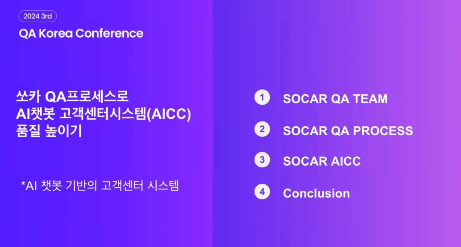 발표 내용은 쏘카 플랫폼 QA 팀에 대한 설명과 쏘카 QA 프로세스, AI 챗봇 고객센터 시스템과 성과에 대한 설명을 해주신다고 하셨습니다.