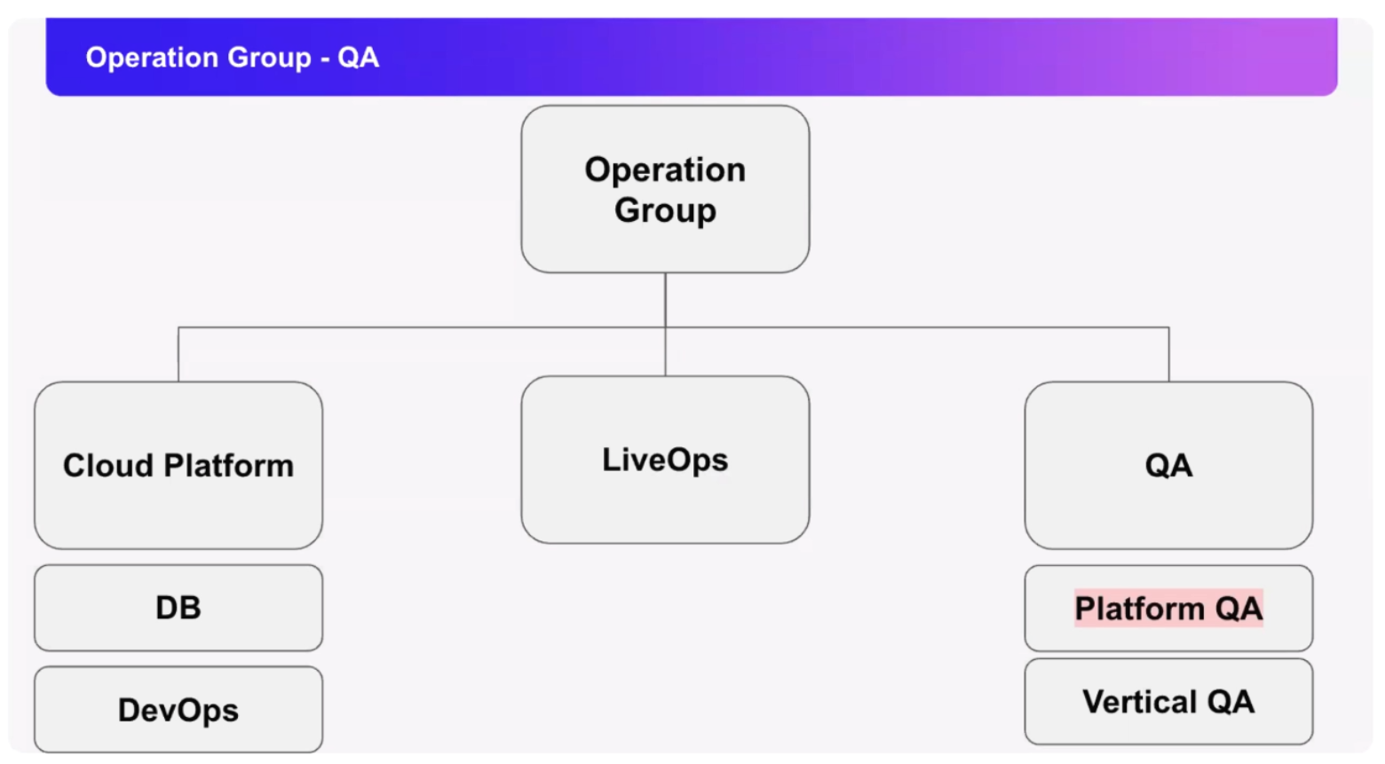 쏘카의 QA 팀 구조를 설명해 주시면서 간단한 조직도를 보여주셨습니다. QA팀은 Operation Group에 속해있고, 그중 QA팀은 플랫폼 QA와 버티컬 QA로 나뉘어 업무를 진행한다고 하시네요. Operation Group 전체가 쏘카의 안정적인 배포와 운영을 담당하며 QA는 SW 품질을 보장하는 역할을 담당하고 있다고 하셨습니다.