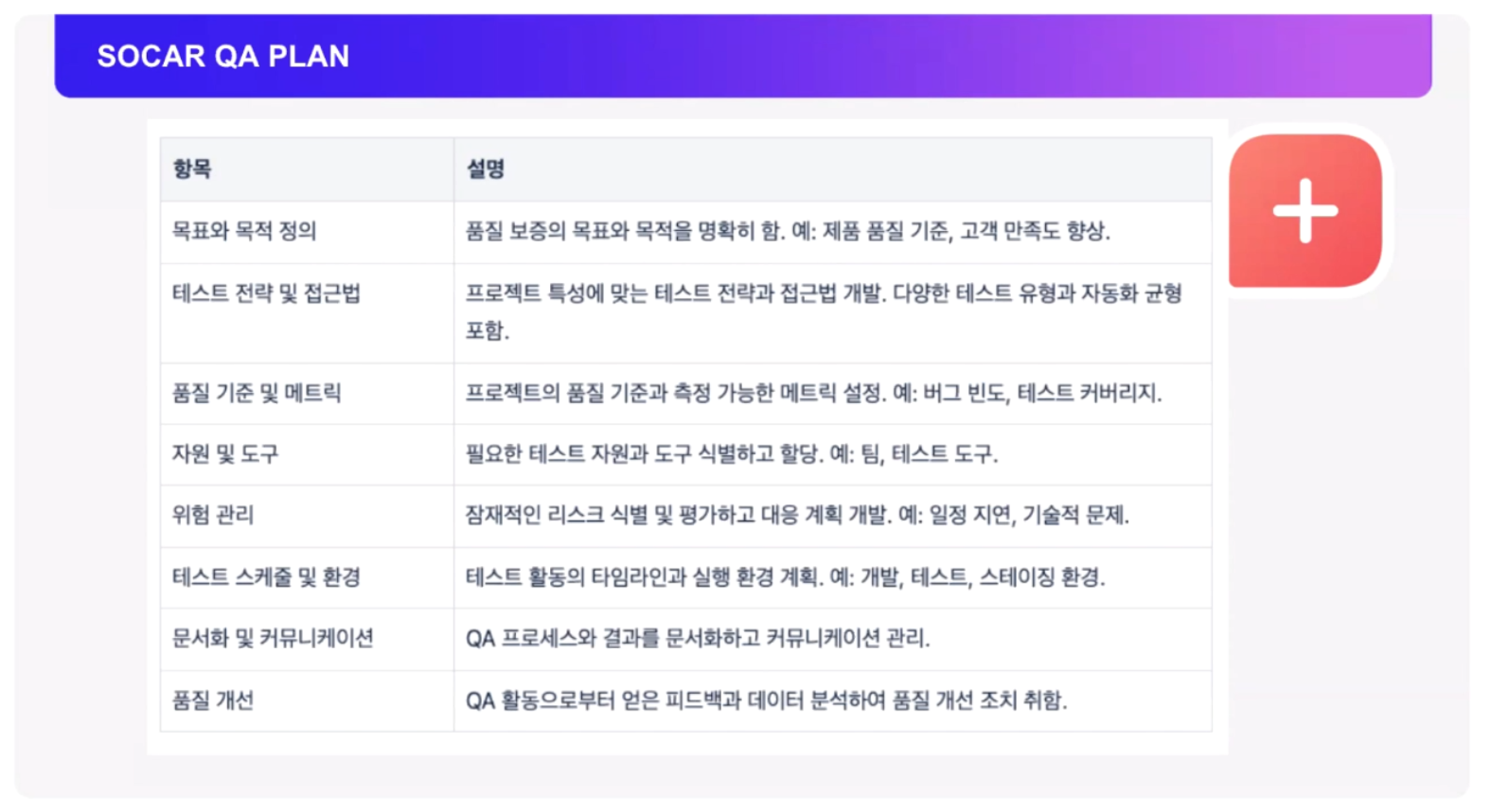 QA 계획은 첨부한 이미지 내용처럼 8가지 기준을 가지고 소프트웨어 관리를 명확히 하기 위한 노력을 하셨다고 하네요.