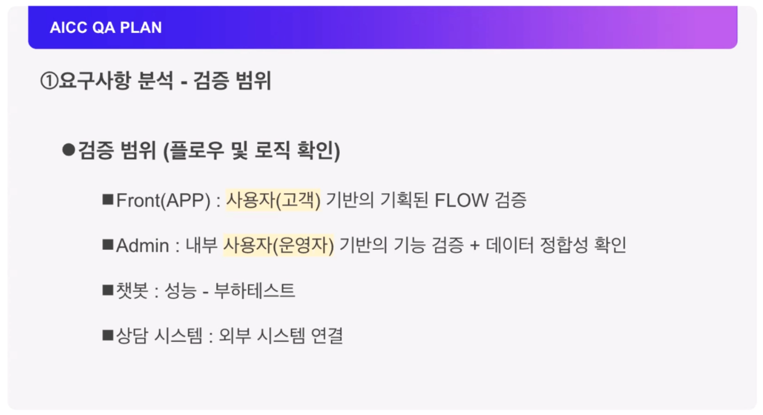 그리고 이 GPT를 활용한 AI 답변 시스템의 QA는 어떻게 진행했는지에 대한 설명을 해주셨습니다. 가장 먼저 검증 범위를 정했다고 하시네요. Front와 Admin을 구분하여 어떤 중심으로 검증을 할 것인지 나누고 성능 테스트와 연동 부분까지 검증 범위를 구분하여 계획했다고 하셨습니다.