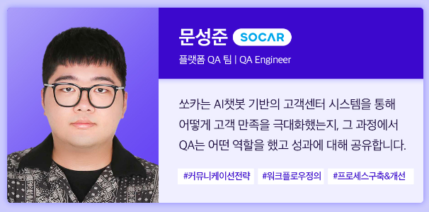 QA 컨퍼런스의 여섯 번째 발표는 문성준 님이 발표해 주셨습니다. 쏘카에서 사용하고 있는 AI 챗봇 기반의 고객센터 시스템은 고객 만족을 위해 어떤 노력을 했는지, QA 업무는 어떤 작업을 진행했는지 그 결과 성과는 어떻게 나왔는지에 대한 경험 위주의 발표를 진행해 주셨습니다.