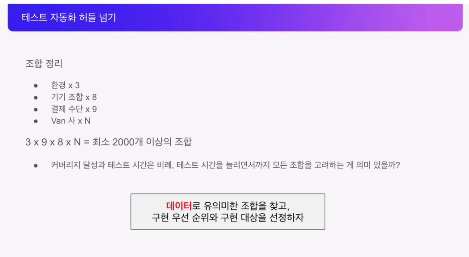 위에서 언급한 내용들을 다 조합해서 테스트를 한다면 2000개 이상의 조합이 나오기 때문에 오히려 테스트 수행 시간이 오래 걸릴 것이라 판단하여, 정말 필요한 항목들만 추려내고 Dev 환경을 지원하는 항목만 대상으로 선정해서 테스트 범위를 수정했다고 하셨습니다.