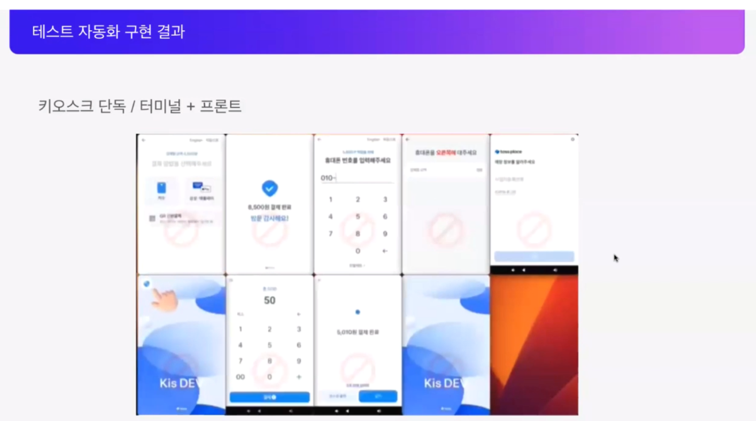 발표를 시작하기 전 토스 단말기를 소개해주셨고, 고객용 단말기에서는 Adb(Android Debug Bridge)를 사용할 수 없도록 제작되었기에 테스트용 기기에서만 테스트 자동화를 수행할 수 있다고 알려주셨습니다. 실제 결제 수단을 사용해서 결제를 하는 것까지 자동화 테스트를 수행한다고 하시네요.