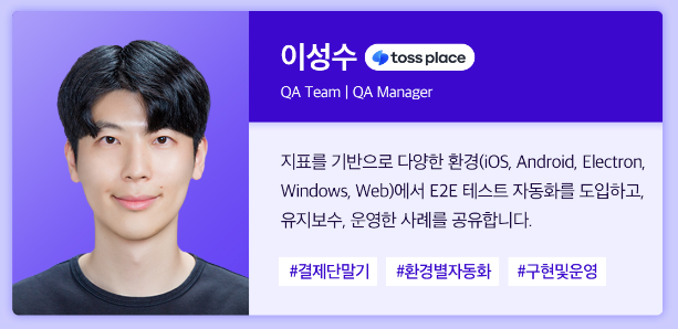 QA 컨퍼런스의 일곱 번째 발표는 이성수 님이 발표해 주셨습니다. 토스 플레이스의 토스 단말기를 테스트하는 방식을 설명해 주시면서 E2E 테스트를 어떤 방식으로 자동화했는지, 자동화할 수밖에 없었는지에 대해 설명을 해주셨습니다.
