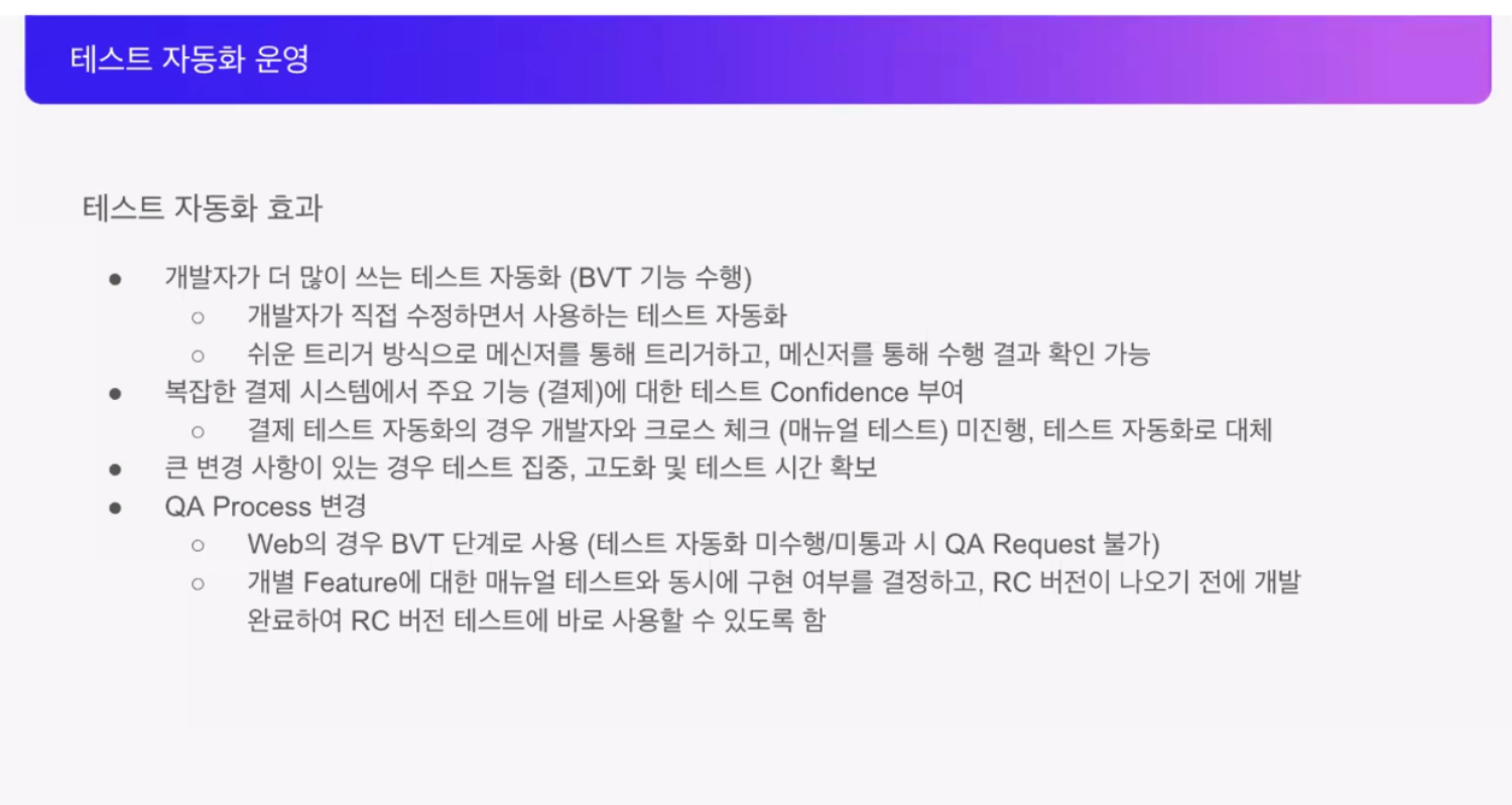 테스트 자동화 환경이 구성된 만큼 개발자가 더 많이 사용해서 업무 효율성을 올릴 수 있었고, 복잡한 결제 시스템 중 결제 관련된 테스트의 신뢰성을 쌓을 수 있는 효과를 가져왔다고 하셨습니다. 큰 변경사항이 있을 때만 테스트를 집중적으로 수행할 수 있어서 효율적인 업무 분담이 가능해졌고, 매뉴얼 테스트를 진행하지 않기 적은 공수로 많은 효과를 불러올 수 있었다고 하셨습니다.