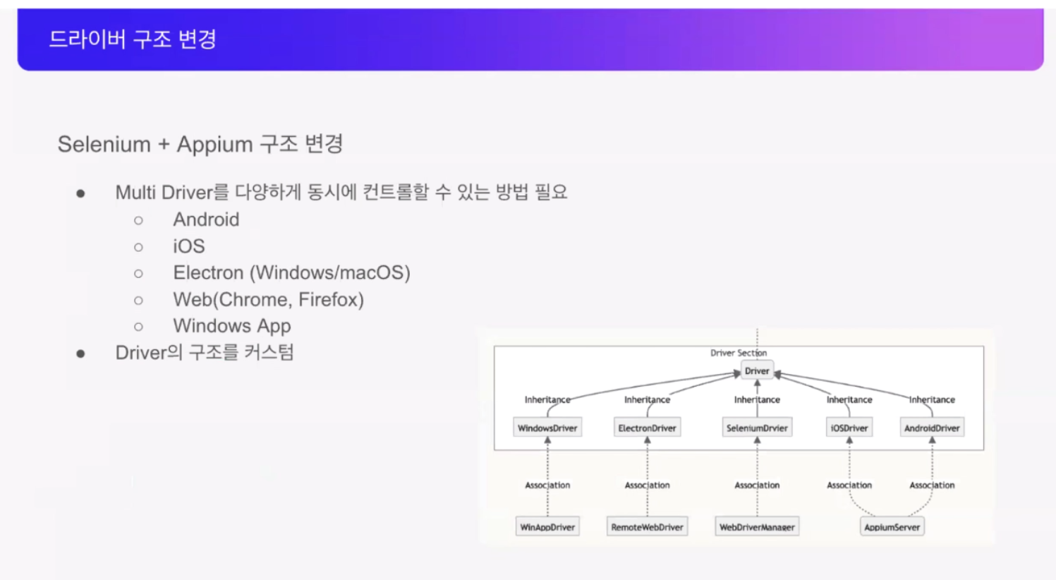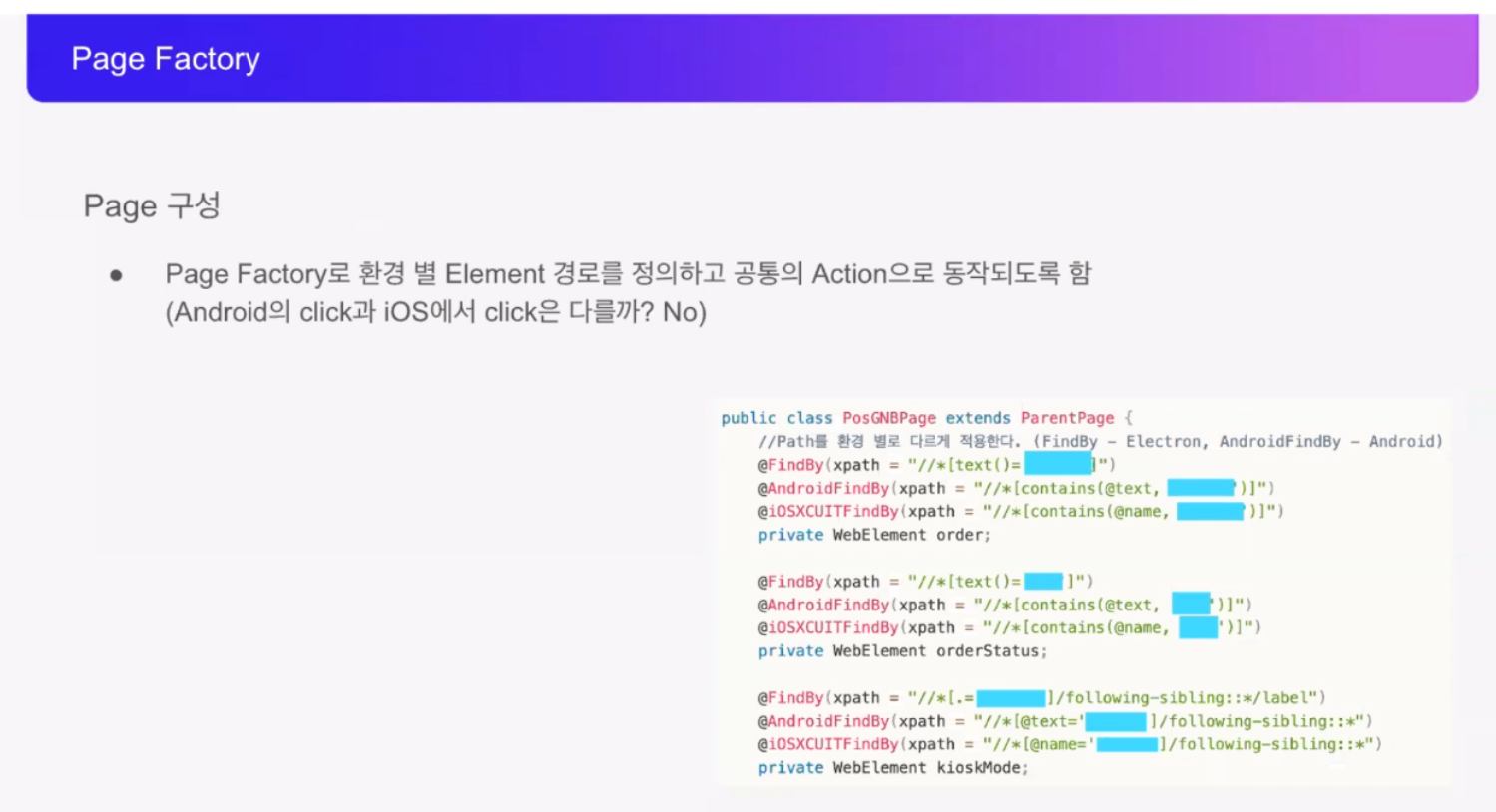 그리고 다양한 환경에 대한 테스트 대응 방법에 대한 설명을 해주셨습니다. 기기별로 다른 상황에서 동일한 코드를 수행하기 위해 Page Factory 개념을 사용하셨다고 하셨어요.