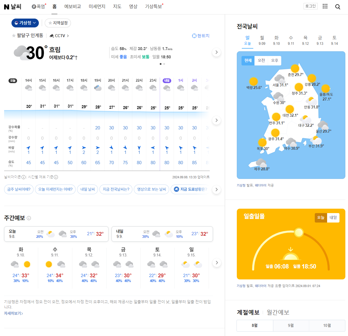 우선 날씨 홈 화면 입니다. 상단에 날씨 관련 메뉴로 이동할 수 있는 "홈", "예보비교", "미세먼지", "지도", "영상", "기상특보" 페이지가 보이네요.