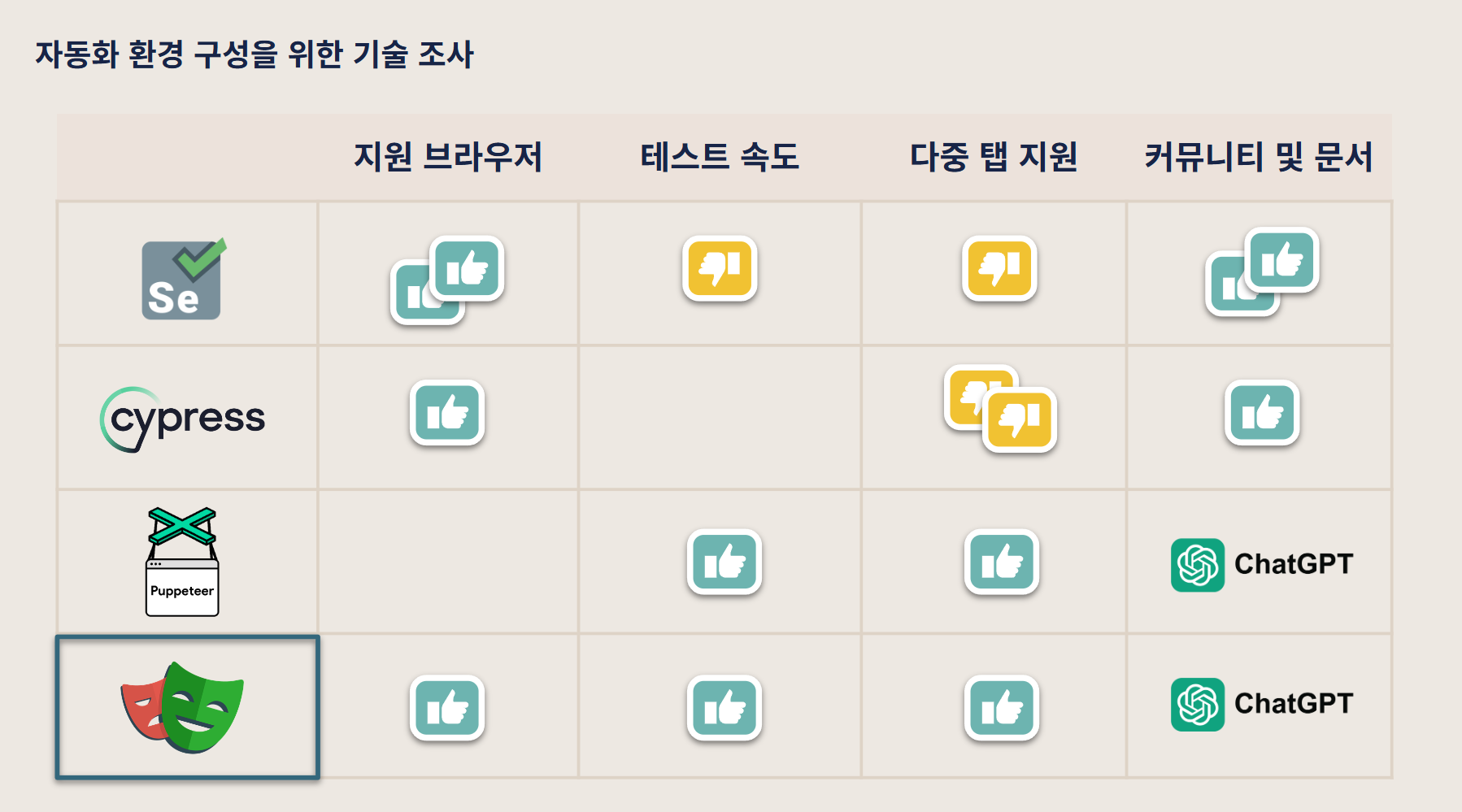 네 가지 툴 비교는 더 상세하게 분석을 하였지만 간략하게는 그림처럼 평가하고 측정하여 Playwright를 선정하게 되었습니다.