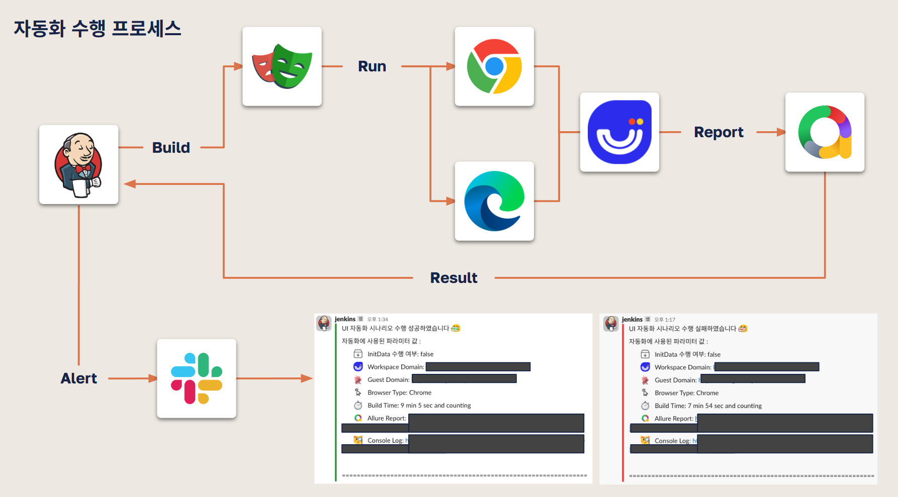 자동화를 사용하는 개발자, 기획, PM 분들은 TestRail에서 시나리오 목록과 동작 방식을 확인하고 원하는 시나리오와 테스트를 수행할 도메인을 설정 후 Jenkins 빌드를 수행하면 테스트가 수행되는 프로세스를 구성하였습니다.