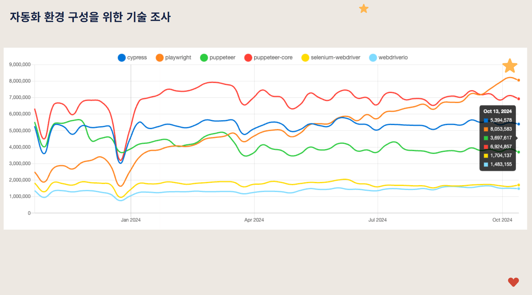 1~2월에 걸쳐서 기술조사를 진행하였고, Playwright를 선정하였는데, 현재 npm trand를 확인한 결과 네 가지의 라이브러리 중 가장 많이 다운로드하여서 사용하고 있는 라이브러리가 되어있네요! 나쁘지 않았던 채택이라는 것을 증명하는 자료였습니다 😎