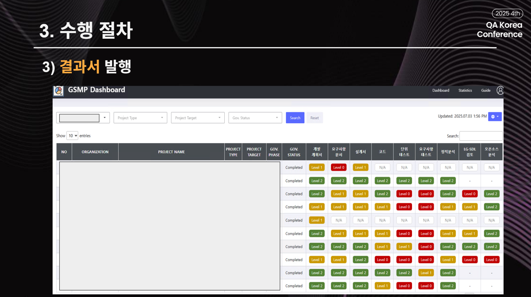 거버넌스 점검을 통해 각 프로젝트의 산출물들은 어느 정도의 성숙도 레벨을 가지고 있는지 확인할 수 있으며, 각 조직에서 어떤 부분이 부족한 지 대시보드를 통해 확인할 수 있다고 하셨습니다.