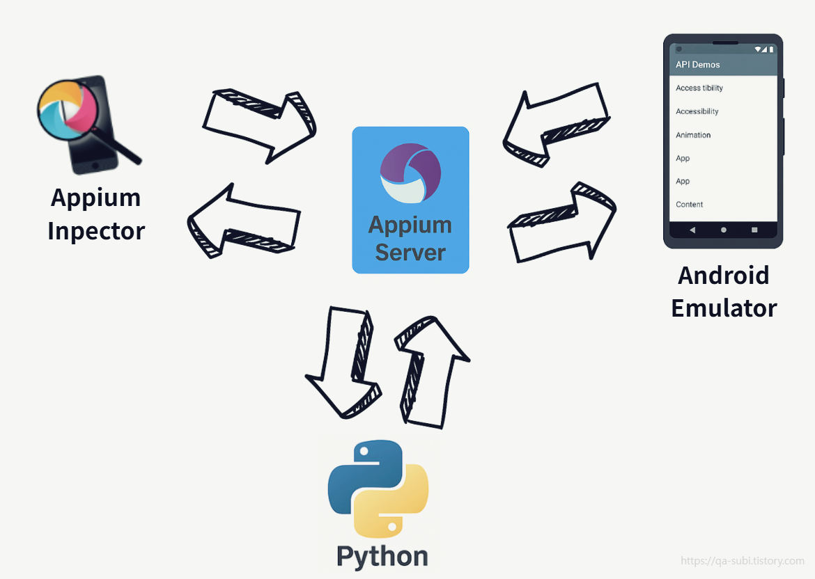 연결 방식은 대략 아래 이미지처럼 Appium 서버를 통해서 요소를 찾기도 하고, 자동화를 수행하는 방식으로 구성됩니다.