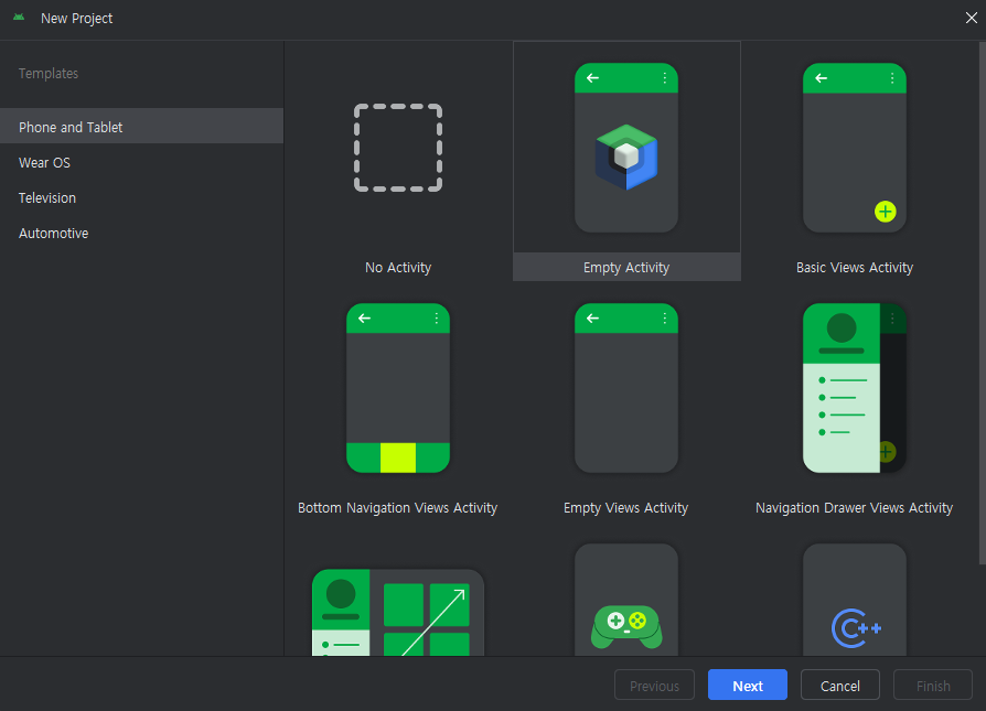 설치한 Android Studio에서 프로젝트를 생성합니다. 저는 Empty Activity를 선택해서 프로젝트를 만들었습니다.