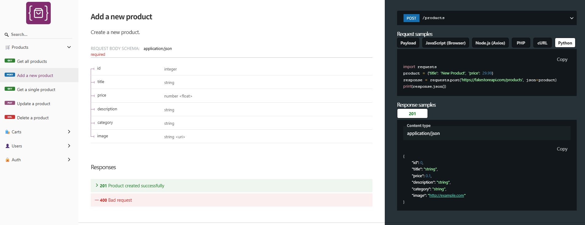 위에 보이는 화면처럼 상품에 대한 API 테스트 예제를 확인할 수 있습니다.