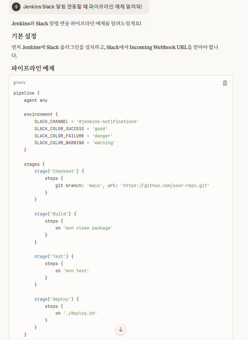 간단한 예시로 Jenkins Slack 알림 연동할 때 어떤 식으로 파이프라인을 구성해야 하는지 상세히 설명해 주기 때문에 설정에 문제가 있는 부분들은 빠르게 AI를 활용해서 해결하고, QA 업무에 더 집중할 수 있었습니다.
