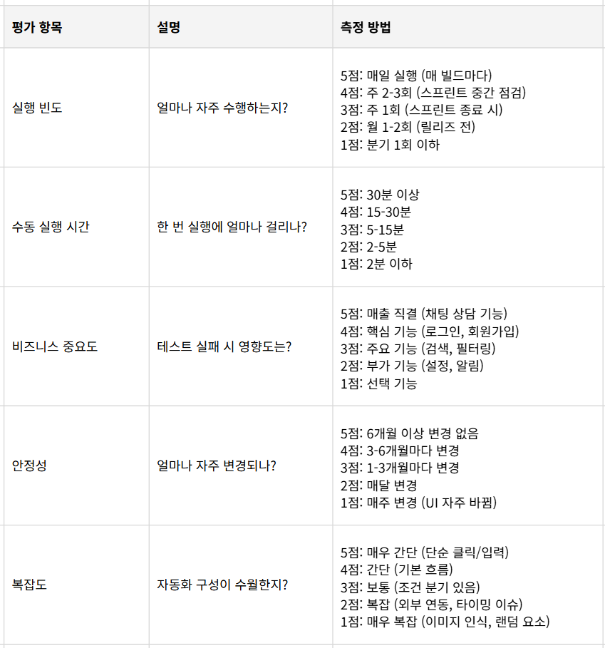 많은 매뉴얼 테스트 케이스를 전부 자동화로 변환하는 것은 비효율적이라고 생각되었고, 어떤 기준으로 TC를 선정할지 고민하게 되었습니다.