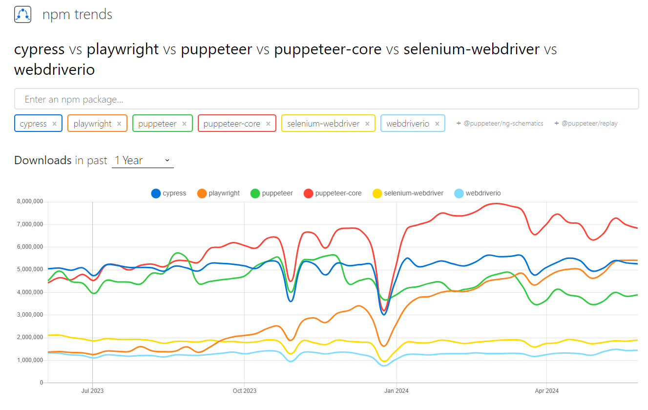 그래서 바로 npm Trends 사이트로 접속하여 현재 대중적으로 알려져있는 Selenium 외 Cypress, Puppeteer, Playwright 라이브러리의 다운로드 현황을 조사해봤습니다.